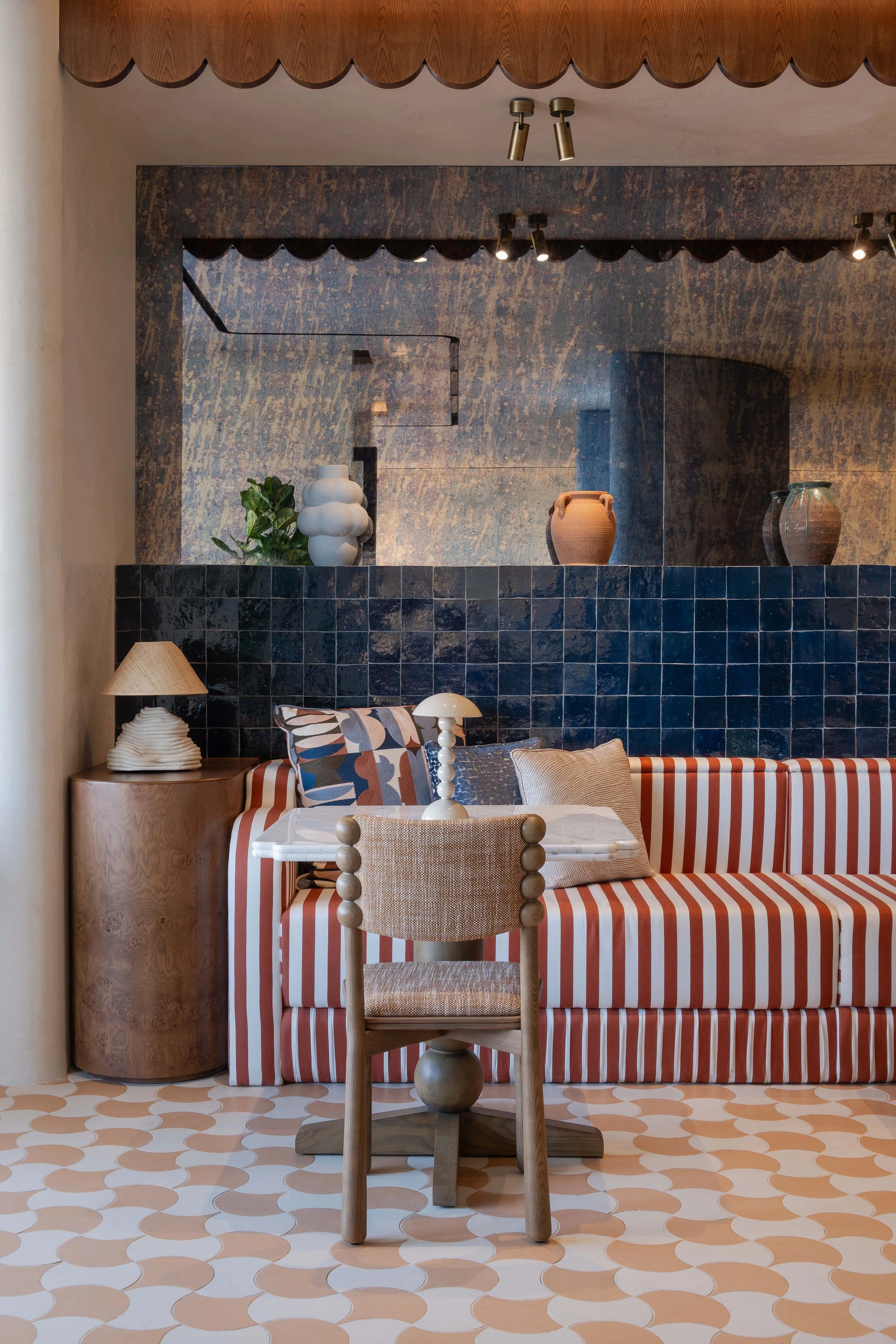 Terracottas and deep blues continue to define the palette, softened by warm neutrals and playful wavy motifs expressed through custom joinery, floor patterns, and textile details. The more intimate scale allows for a heightened focus on detail. Curtains, bobbin legged furniture, and expressive finishes are layered to create moments of contrast and quiet discovery.